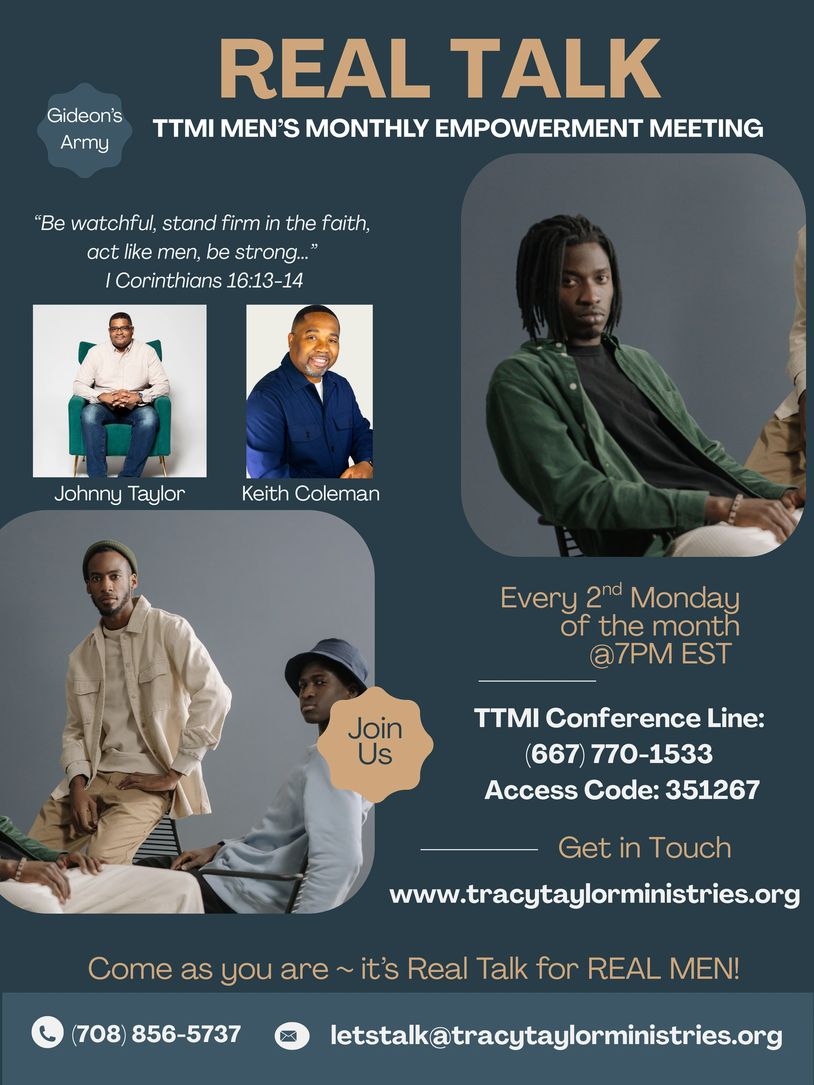 Tune into Gideon’s Army— men’s group monthly empowerment “REAL TALK” every 2nd Monday of the month at 7PM EST on TTMI conference line (667) 770-1533 access code 351267 with Johnny, Keith, and Carl